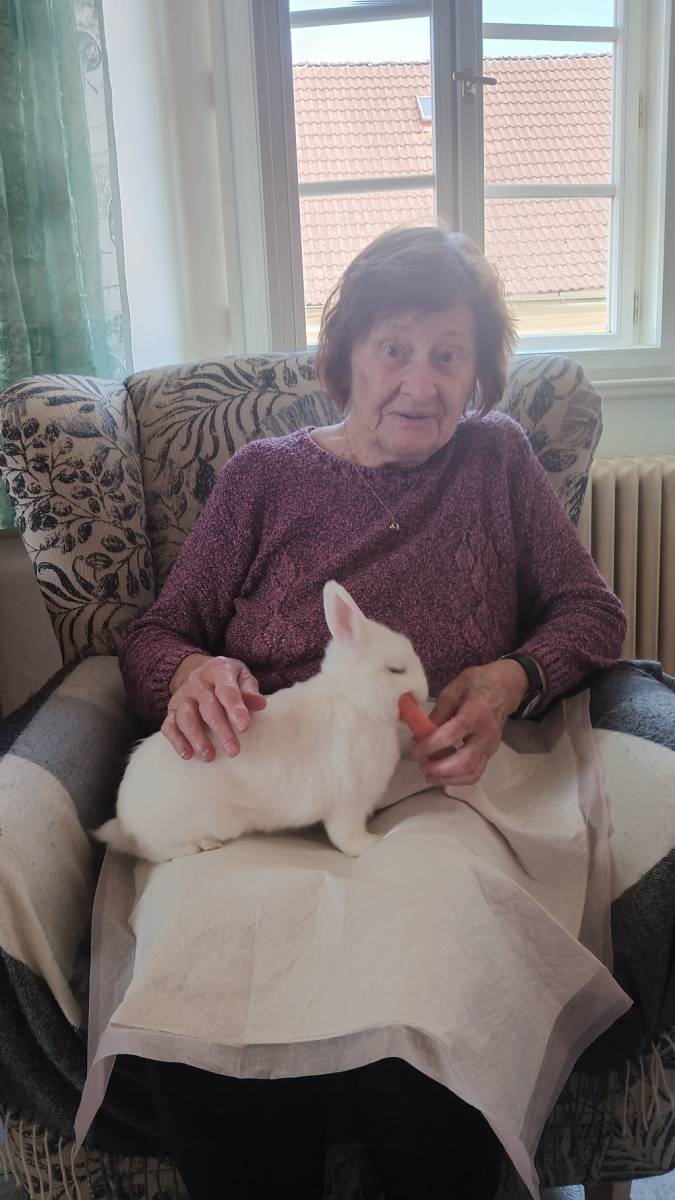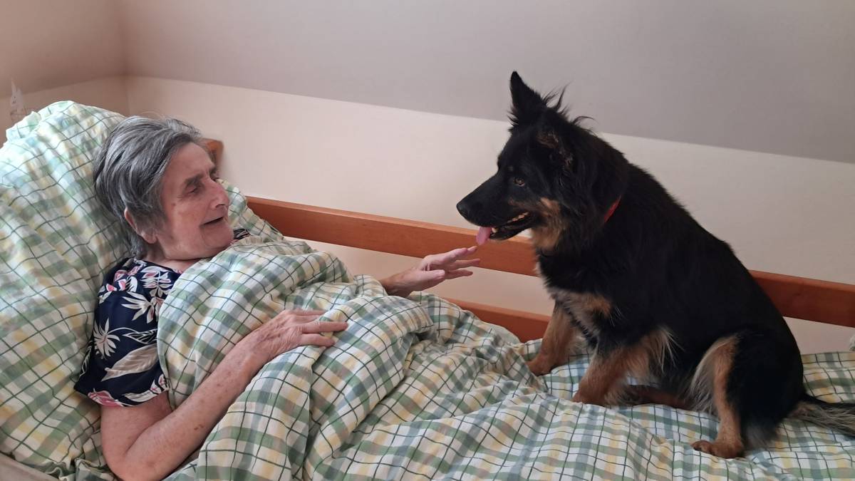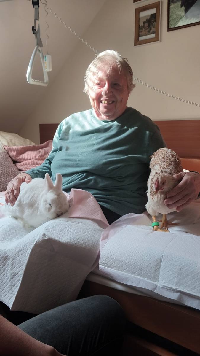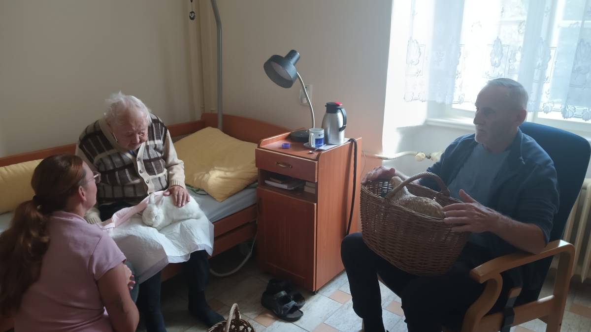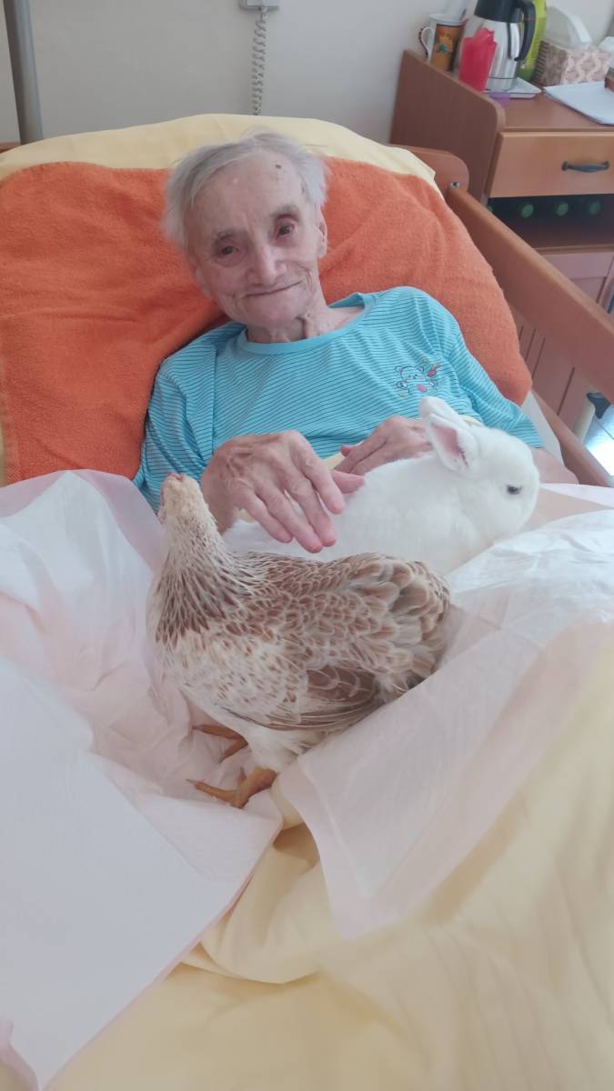 Individuálně na pokoje nás přišli potěšit canisterapeutický pes Kira, slepička Emilka a králíček Bob.
